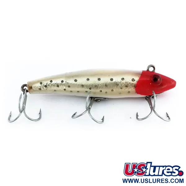 Con una lunghezza di 9 cm (3 1/2"), il corpo di questa classica esca affondante presenta la distintiva livrea Color 11. Il design è caratterizzato da una testa rossa audace abbinata a un corpo a scaglie dorate con punteggiatura scura, una combinazione ideale per insidiare lucci, salmoni o lucioperca. Con un peso di 14 g (1/2 oz), il modello TT 11 è costruito per presentazioni versatili sia a lancio che a traina, coprendo efficacemente diverse profondità. Sul ventre bianco, vicino all'armatura posteriore, il timbro "TT 11" rimane chiaramente visibile. Questo esemplare prodotto negli Stati Uniti ha una valutazione di 4/5, mostrando leggeri segni sulla finitura dorata e sulla testa rossa che ne riflettono la storia. Identificata dal codice prodotto 9835, questa esca L&S Bait Mirro riflette l'artigianato della metà del secolo scorso tipico della Florida, completa dei suoi inserti originali per gli occhi rossi e tre ancorette argentate. L'assetto affondante permette al pescatore di sondare diversi strati della colonna d'acqua a seconda del recupero.