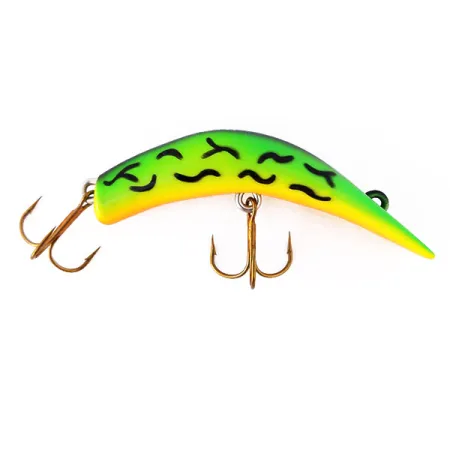 Vivaci pattern Fire Tiger con distintive strisce ondulate nere caratterizzano questo esemplare, che rivela una luminescenza verde brillante in condizioni di scarsa illuminazione. Con una lunghezza di 6,5 cm (2 1/2") e un peso di 7 g (1/4 oz), questo Lazy Ike è catalogato con il codice prodotto 10593. È progettato per lavorare a profondità ridotte, tra 0,3 m (1 ft) e 0,6 m (2 ft), rappresentando una scelta tattica per insidiare lucioperca o lucci in acque basse. La sagoma presenta la classica forma del corpo curva tipica del marchio americano, equipaggiata con due ami tripli affilati fissati da minuteria robusta. Questa specifica esca è inutilizzata, in condizioni eccellenti con un punteggio di 5/5. I collezionisti apprezzeranno la nitidezza della vernice e la finitura originale di fabbrica che la rendono un elemento essenziale sia per il casting che per la traina.