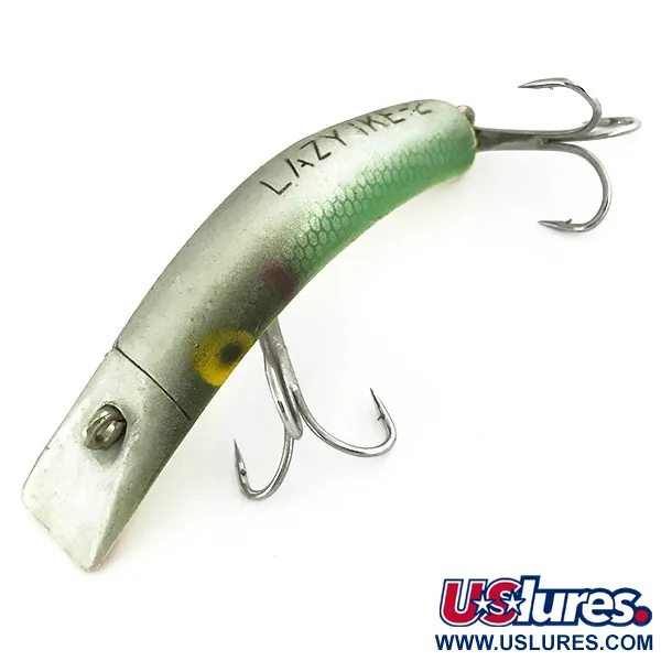 Con un peso di 7 g (1/4 oz), questo classico Lazy Ike 2 (codice 6926) presenta l'iconica livrea Pike (luccio) immediatamente riconoscibile dai collezionisti. Il corpo da 6,5 cm (2 1/2") è caratterizzato da una base grigio-argento con distinti motivi a scaglie verdi sul dorso, accentuati da un sottomento rosso vivace e da una singola macchia branchiale rossa. Sulla parte superiore del corpo ricurvo è visibile la stampigliatura „LAZY IKE 2“, segno distintivo di queste esche prodotte negli USA. Per chi insidia sandre o lucci in acque basse, questo modello galleggiante è progettato per una profondità di 0,3 m - 0,6 m (1 ft - 2 ft). La componentistica consiste in due robusti ami tripli fissati tramite attacchi a vite, comuni per l'epoca di produzione. Gli occhi gialli dipinti con pupille nere sono ancora nitidi, contribuendo a una valutazione dello stato di conservazione pari a 5/5. Sia per il lancio che per la traina, il suo design shallow-running lo rende un'aggiunta versatile a qualsiasi cassetta di attrezzatura d'epoca.