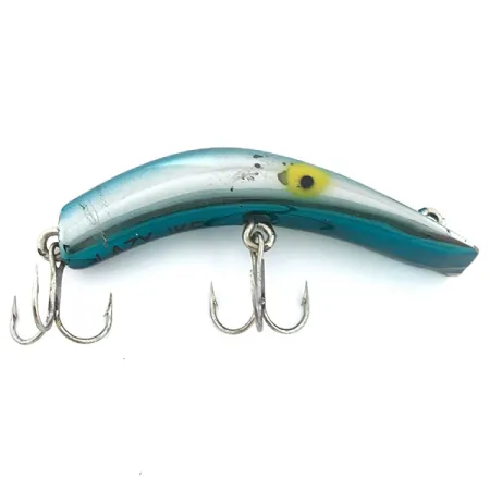 Rifinito in una splendida colorazione Blu Chiaro Metallizzato su Argento Specchiato, questo esemplare da 14 g (1/2 oz) presenta il classico profilo a banana diventato un'icona nelle cassette da pesca degli USA. Con una lunghezza di 8,5 cm (3 1/4"), l'esca riporta il nome "LAZY IKE" stampato chiaramente sulla pancia, segno distintivo cercato dai collezionisti come prova di autenticità. Questo modello, codice prodotto 6739, è una versione galleggiante progettata per acque poco profonde tra 0,3 e 0,6 m (1-2 ft). La finitura è conservata eccezionalmente bene, con una valutazione dello stato pari a 5/5, e la pancia argento specchio garantisce un forte potere riflettente. È armato con due ancorette affilate montate su ferramenta robusta. Gli occhi dipinti di giallo con pupille nere spiccano nella parte anteriore, conferendo personalità al corpo metallico. Ideata sia per lo spinning che per la traina a sandra o luccio, l'esca riflette la robustezza tipica dell'attrezzatura americana di metà secolo. Il dorso sfuma in una tonalità blu chiaro, in netto contrasto con i fianchi argentati.