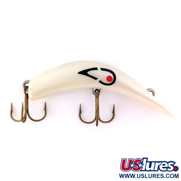 Lungo 6 cm (2 1/4"), il profilo curvo distintivo di questo artificiale vintage prodotto negli USA è rifinito in un pulito Bianco Perla. Questo esemplare, identificato dal codice prodotto 9990, presenta la nota grafica dell'occhio stilizzato nero e rosso stampata sul lato. Con un peso di 6 g (3/16 oz), la forma a banana del corpo è pensata per applicazioni in acque poco profonde tra 0,3 m e 0,6 m (1 ft e 2 ft). Due ancorette in bronzo sono in condizioni eccellenti, coerenti con la valutazione complessiva di 5/5 dell'esterno. L'occhiello di fissaggio è incassato nella parte superiore del muso inclinato, una caratteristica progettuale per tecniche di lancio e traina rivolte a specie come lucci e luccioperca. La lucentezza perlata mantiene il suo splendore originale su tutto il corpo in plastica.