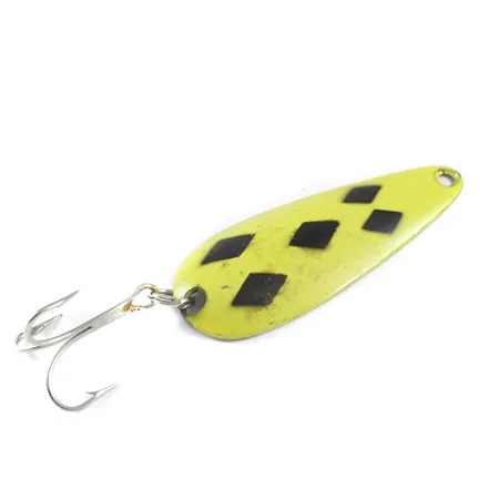 Cinque diamanti neri disposti nel motivo classico su una finitura giallo vibrante definiscono l'estetica di questo ondulante prodotto in Canada. Con un peso di 3/4 oz (21 g) e una lunghezza di 2 3/4" (7 cm), questo modello di taglia #1 offre un profilo significativo per insidiare lucci o trote di lago. Il retro in finitura ottone reca il nome stampato del produttore, Len Thompson, la cui eredità produttiva nella regione risale al 1929. Questo esemplare, con codice prodotto 1748, mostra lievi segni di utilizzo sulla vernice e sul metallo, pur rimanendo in condizioni 4/5. Un'ancoretta color argento è fissata sul retro tramite un robusto anellino spaccato, rendendolo pronto per il lancio o la traina. La specifica curvatura del metallo è progettata per creare un movimento oscillante lento durante il recupero. La base in ottone rimane visibile sul lato opposto, offrendo un riflesso sottile per contrastare con la faccia gialla ad alta visibilità.