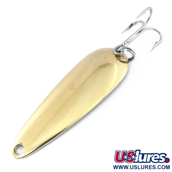 Con una lunghezza di 3 1/4" (8 cm), questo ondulante in metallo massiccio è rifinito in oro brillante per offrire un profondo bagliore metallico. Questo Len Thompson #2, identificato con il codice prodotto 10732, pesa 1 oz (28 g), il che lo rende perfetto per raggiungere le strutture più profonde durante il lancio o la traina a lucci e trote di lago. Il lato concavo dell'esca presenta lo stampo classico "LEN THOMPSON NO. 2", un marchio distintivo della produzione canadese iniziato nel 1929. Il design bilanciato produce un movimento oscillante lento che simula un pesce esca di grandi dimensioni. La componentistica include un'ancoretta argentata affilata e un robusto anello spaccato, entrambi in condizioni eccellenti. Questo esemplare è in condizioni 5/5, mantenendo una superficie pulita e altamente riflettente su entrambi i lati. Il colore oro rimane vibrante, garantendo alta visibilità per i pesci predatori in varie condizioni di trasparenza dell'acqua.
