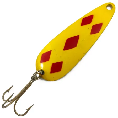 Cinque audaci rombi rossi su una finitura gialla brillante contraddistinguono un design che è stato un punto fermo nelle cassette da pesca fin dall'inizio della produzione nel 1929. Con un peso di 28 g (1 oz), questo Len Thompson #2 (codice prodotto 4653) è costruito con uno spessore che favorisce il suo caratteristico movimento oscillante lento durante il recupero. Il retro dell'esca presenta un timbro chiaro che la identifica come "LEN THOMPSON NO. 2", mostrando il metallo di base color ottone sottostante. In condizioni valutate 5/5, la vernice rimane nitida e i componenti, incluso l'amo triple originale, sono ben conservati. Questo esemplare da 8 cm testimonia la reputazione del marchio per l'equilibrio, rendendolo una scelta affidabile per lo spinning o la traina in acque profonde dove spesso si aggirano salmoni e steelhead.
