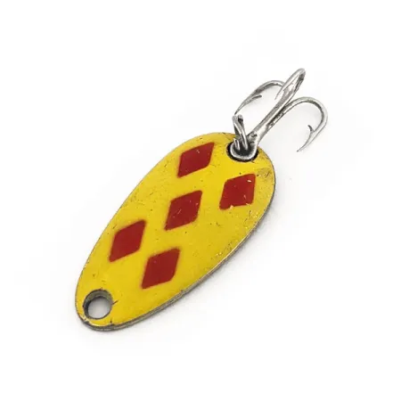 Un corpo compatto da 1" (2,5 cm) sfoggia l'inconfondibile finitura Five of Diamonds gialla e rossa su questo classico canadese. Con un peso di 1/8oz (3,5 g), il Len Thompson #6 è progettato con il bilanciamento che definisce il marchio dal 1929. Il retro presenta l'autentico marchio del produttore stampato direttamente nel metallo, che identifica il numero del modello e la sua eredità. Questo esemplare, assegnato al codice prodotto 11269, mantiene la sua vivacità originale su tutto lo smalto giallo e i cinque accenti a diamante rosso. I pescatori si affidano spesso a questi ondulanti per un'azione oscillante lenta che imita i piccoli pesci esca durante il lancio, la traina o il jigging per trote e lucci. L'attrezzatura consiste in un robusto amo triplo fissato da un anello spaccato. Ogni aspetto di questa esca riflette gli standard di produzione stabiliti in Canada quasi un secolo fa. Le condizioni dell'esemplare sono valutate 5/5, con la vernice e il metallo che rimangono molto puliti.