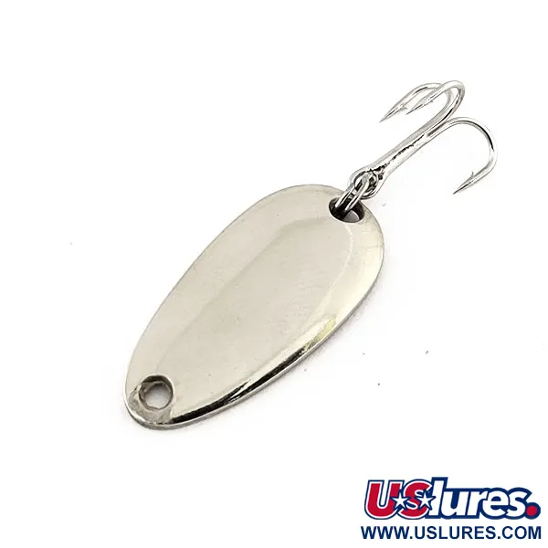 Sulla parte inferiore concava di questo ondulante nichelato sono stampate chiaramente le parole "LEN THOMPSON NO. 6", che identificano un design diventato un punto fermo nelle cassette da pesca da decenni. Con una misura di esattamente 2,5 cm (1") e un peso leggero di 3,5 g (1/8 oz), l'esca è dimensionata per insidiare i pesci predatori in varie condizioni d'acqua. La finitura in nichel brillante fornisce una superficie pulita e riflettente per imitare le scaglie di un piccolo pesce esca. La sua forma a goccia è specificamente bilanciata per produrre un movimento oscillante lento, una caratteristica tecnica che ha reso il marchio un punto di riferimento per lucci, salmoni e trote di lago. Questo particolare esemplare, codice prodotto 11270, si presenta in condizioni 5/5, con un corpo altamente preservato e un'ancoretta affilata color argento. L'attrezzatura è fissata saldamente attraverso il foro di precisione sulla coda, rendendolo pronto per il lancio, la traina o il jigging.