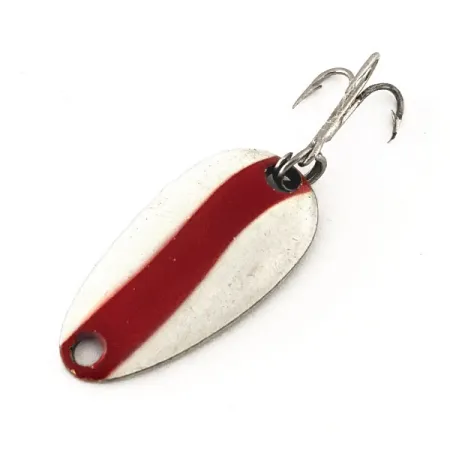 Sul retro color ottone è chiaramente impresso il marchio 'LEN THOMPSON NO. 6', che identifica l'origine di questo piccolo ondulante. Questa esca di produzione canadese, con codice prodotto 11312, presenta una classica finitura bianca accentuata da una decisa striscia rossa diagonale sulla parte anteriore. Con una lunghezza esatta di 2,5 cm (1") e un peso leggero di 3,5 g (1/8 oz), l'ondulante è costruito su una base di ottone massiccio. La componentistica consiste in un unico amo triplo color argento fissato all'estremità più larga tramite un robusto anellino spaccato. Valutata in condizioni 5/5, le superfici in smalto e metallo appaiono ben mantenute e pulite. Storicamente, questi ondulanti sono bilanciati per un movimento oscillante lento, una tecnica usata dai pescatori per imitare piccoli minnow o pesce foraggio sin dalla nascita del marchio nel 1929. Un foro di attacco è praticato con precisione all'estremità stretta dell'esca.