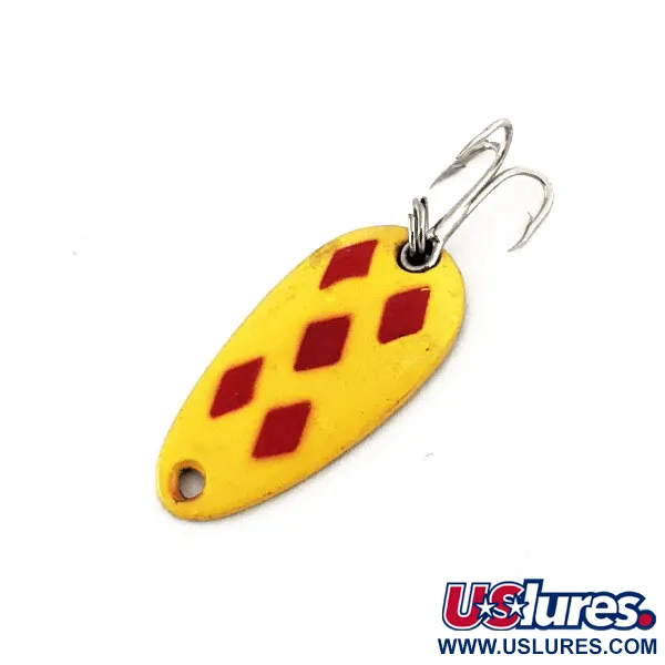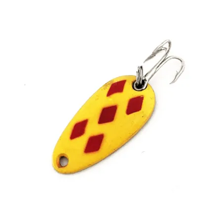 Direttamente punzonate sul retro color ottone si trovano le scritte "LEN THOMPSON NO. 6", che identificano questo ondulante da lancio prodotto in Canada. Con una lunghezza compatta di 2,5 cm (1") e un peso di 3,5 g (1/8 oz), presenta il riconoscibilissimo motivo Five of Diamonds, composto da cinque rombi rossi stampati su una base gialla. Le condizioni dell'ondulante sono eccezionali, con una finitura ben conservata e metallo lucido sul retro, meritando un punteggio di 5/5. Identificato con il codice prodotto 11369, questo modello monta un'ancoretta con finitura argentata collegata tramite un anello spaccato, ideale per lo spinning o la traina leggera a trote e persici. La forma a goccia e lo spessore dell'ottone sono un segno distintivo di Len Thompson dal 1929, garantendo un nuoto bilanciato. La verniciatura frontale rimane nitida e vivace, in contrasto con il lato inferiore in ottone lucido.
