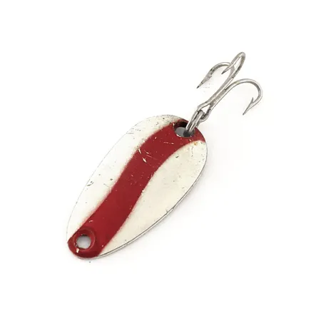 Una vistosa striscia rossa diagonale attraversa la faccia bianco crema di questo ondulante compatto da 2,5 cm (1 pollice). Con un peso di 3,5 g (1/8 oz), questo reperto vintage reca il codice prodotto 11497 e rappresenta un pilastro della gamma Len Thompson. Il lato posteriore presenta una finitura in ottone con un timbro che lo identifica come modello "NO. 0", nonostante la designazione a catalogo #6. I pescatori si affidano a questi cucchiaini per il loro caratteristico movimento oscillante lento durante il lancio o la traina per specie come trote e persici. Questo esemplare è in condizioni 5/5, con lievi segni di usura superficiale e sottili screpolature nella vernice, oltre a scurimento e ossidazione sull'ottone e sull'ancoretta originale. Il profilo a goccia è un classico di Len Thompson, un design prodotto fin dal 1929 per imitare il pesce foraggio.