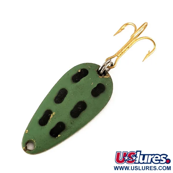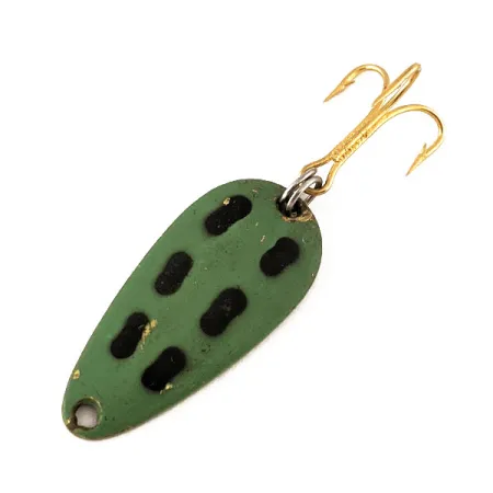 La vernice verde con i caratteristici segni ovali neri conferisce alla parte anteriore di questo cucchiaino Len Thompson #7 da 5g (3/16oz) il suo aspetto inconfondibile. Con una lunghezza di 3,4cm (1 1/4"), questo esemplare presenta una struttura in ottone massiccio visibile sul retro, dove il nome Len Thompson e il logo a forma di otto sono punzonati nel metallo. La dotazione comprende un'ancoretta con finitura dorata fissata tramite un anellino spaccato argentato, una configurazione progettata per resistere nel tempo durante il lancio o la traina in vari ambienti d'acqua dolce. Segni di usura appaiono come lievi perdite di colore lungo i bordi e leggeri graffi superficiali sul retro in ottone, per una valutazione complessiva dello stato di conservazione di 4/5. Identificato dal codice prodotto 11191, questo classico di produzione canadese utilizza un corpo in ottone stampato che offre un riflesso metallico in contrasto con la faccia verde opaca. Le scritte incise sul retro rimangono nitide, evidenziando la qualità del processo produttivo d'epoca.