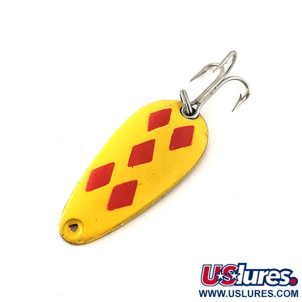 Cinque rombi rossi sono stencilati con precisione su uno smalto giallo vibrante, creando l'iconico motivo "Five of Diamonds" che ha reso famosi questi ondulanti canadesi fin dal 1929. Questo esemplare è un Len Thompson #7, lungo 3,4 cm (1 1/4") e con un peso di 5 g (3/16 oz). Il retro presenta una finitura in ottone lucido, profondamente punzonata con il marchio del produttore "LEN THOMPSON No.7" per certificarne l'autenticità. Progettato per diverse tecniche, tra cui lo spinning e la traina, l'esca è dotata di un'ancoretta argentata montata su un robusto anello spaccato. Registrato con il codice prodotto 11533, l'ondulante è in condizioni 5/5, con una superficie liscia e una verniciatura ad alto contrasto. Il profilo compatto è appesantito specificamente per imitare la presenza di piccoli pesci esca nella colonna d'acqua.