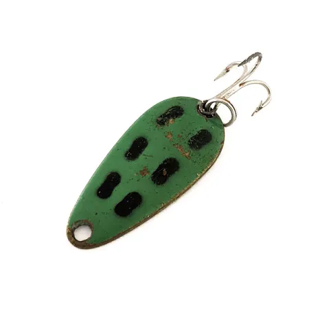 Caratterizzato da una vivace livrea Rana, questo ondulante canadese da 3,5 cm (1 1/2") presenta una superficie superiore verde erba con distintive macchie ovali nere. Sul lato inferiore color ottone è chiaramente impresso il marchio "LEN THOMPSON NO 7", a testimonianza della tradizione di un produttore storico dal 1929. Con un peso di 5 g (3/16 oz), l'esca è progettata per un movimento oscillante lento che imita un piccolo pesce esca. L'ancoretta argentata è assicurata tramite un affidabile anello spaccato e le condizioni generali sono un rispettabile 4/5, con lievi segni del tempo. Catalogato con il codice 11545, la forma a goccia e la base in ottone sono tratti distintivi della linea Len Thompson.