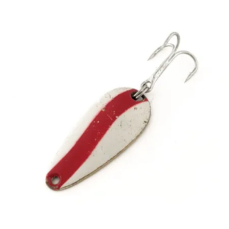 La punzonatura 'LEN THOMPSON No. 7' sul retro in ottone identifica questo cucchiaino come un classico di produzione canadese, realizzato da un'azienda attiva dal 1929. Un'audace striscia rossa a onda attraversa il lato anteriore verniciato di bianco, creando un contrasto elevato progettato per attirare predatori come lucci o trote di lago. Lungo esattamente 3,5 cm (1 1/2 pollici), il suo profilo a goccia è una presenza costante nelle cassette da pesca più esperte. Con un peso di 5 g (3/16 oz), garantisce una buona sensazione sia nel lancio che nella traina leggera. La vernice bianca mostra alcuni piccoli segni e graffi dovuti all'età, meritando una valutazione di 5/5 per le condizioni. Conosciuto per il suo caratteristico movimento oscillante lento, questo modello No. 7 è una scelta affidabile per insidiare i pesci più apatici. L'esca è montata con un robusto amo triplo argentato e può essere identificata con il codice 11642.