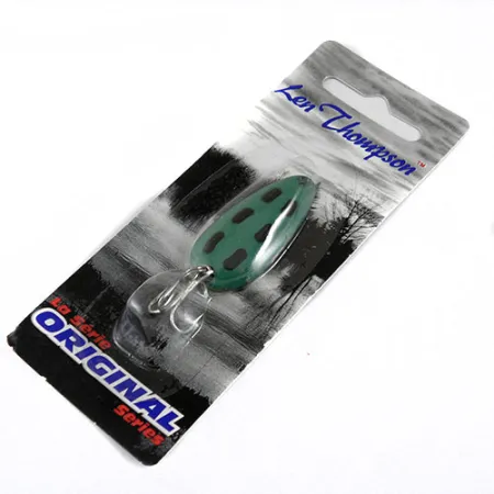 La livrea Green Frog con macchie ovali scure caratterizza la finitura di questo cucchiaino Len Thompson #8, un design classico per la pesca in acque dolci nordamericane. Con un peso di 1/4 oz (7 g), questo artificiale compatto da 4 cm (1 1/2") fa parte della Original Series ed è contrassegnato dal codice prodotto 0741. Questo esemplare è inutilizzato nella sua confezione originale, che riporta la storia del marchio a Lacombe, Alberta, Canada, risalente al 1929. La forma favorisce un movimento oscillante lento durante il recupero o la traina, studiato per imitare il nuoto di un pesce esca. Sul retro della confezione sono visibili il marchio Thompson-Pallister Bait Co. Ltd. e la dicitura specifica 'No. 8 GF'. L'esca è montata con un amo triplo affilato, mantenendo la dotazione originale di fabbrica.