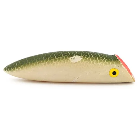 Motivi a scaglie verdi avvolgono la metà superiore di questo classico Les Davis Witch Doctor, sfumando in un ventre color crema pulito che ne evidenzia il carattere vintage. Con un peso di 17 g e una lunghezza di 11,5 cm, questa esca di superficie prodotta negli USA è un pezzo fondamentale per i collezionisti di attrezzatura storica del Pacifico nord-occidentale. La caratteristica faccia piatta verniciata in rosso è progettata per spostare l'acqua, mentre i vivaci occhi gialli con pupille nere offrono un bersaglio ad alto contrasto. Sulla parte inferiore, il marchio "WITCH DOCTOR" rimane nitido e leggibile, a testimonianza della qualità che Les Davis ha infuso nella propria produzione. Valutato in condizioni 4/5, l'esemplare presenta una leggera usura superficiale, tra cui una scalfittura visibile sulle scaglie verdi e lievi graffi sulla coda, sebbene l'integrità strutturale del corpo sia eccellente. Questo articolo specifico, catalogato con il codice prodotto 22704, mette in mostra le livree semplici ma efficaci che hanno definito la produzione americana di esche di metà secolo.
