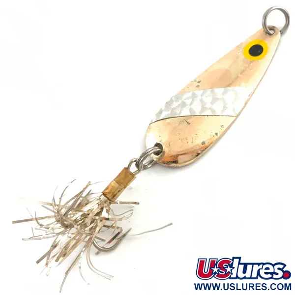 Un peso di 10 g rende questo Lindy Finsel una scelta versatile per una varietà di specie d'acqua dolce. La finitura dorata di questo ondulante da 5,5 cm presenta una caratteristica fascia argentata con motivo a scaglie al centro, che aggiunge una trama contrastante alla superficie riflettente. Un prominente occhio giallo con pupilla nera è posizionato vicino al punto di attacco superiore, mentre il retro è chiaramente stampato con il nome Finsel, indicando le sue origini con Lindy / Little Joe negli USA. Questo particolare modello, identificato dal codice prodotto 4527, è rifinito con una coda in tinsel argentato sull'ancoretta, che fornisce un sottile luccichio. Con una valutazione di 4/5, la doratura mostra lievi segni del tempo con una lucentezza morbida e autentica. La costruzione è completata da robusti anellini spaccati progettati per resistere alla trazione di catture importanti.