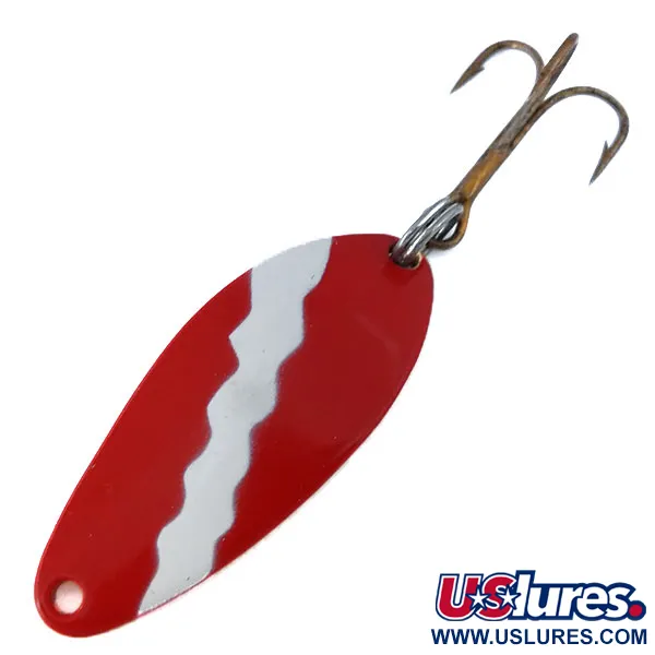 Con un peso di 1/4 oz (7 g), questo classico ondulante da lancio rappresenta l'epoca di produzione originale di Seneca Lure prima che il marchio venisse acquisito da Acme nei primi anni '80. La faccia anteriore è rifinita con un motivo ondulato rosso e bianco ad alto contrasto, un design distintivo per la visibilità in varie condizioni di luce. Sul retro, il metallo color ottone è profondamente marchiato con la dicitura "LITTLE CLEO WIGL LURE SENECA LURE", che ne attesta le radici manifatturiere americane con il codice prodotto 10813. Lungo 1 1/2" (4 cm), il corpo è abbinato a un'ancoretta invecchiata fissata tramite un robusto anello spaccato. Data la valutazione di 4/5, l'esca rimane ben conservata, mostrando solo minimi segni del tempo pur mantenendo nitide le scritte incise e intatta la superficie verniciata. Questo esemplare cattura la qualità specifica del materiale e la profondità di stampaggio caratteristiche della produzione originale della fabbrica Seneca.