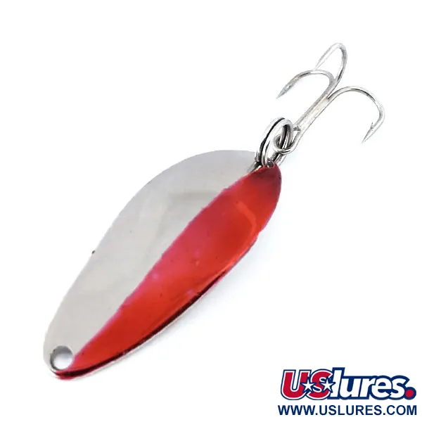 Una decisa striscia diagonale rossa crea un forte contrasto con la finitura in nichel lucido di questo ondulante vintage. Con un peso di 7 g (1/4 oz) e una lunghezza di 4 cm (1 1/2"), il corpo metallico presenta una profonda punzonatura posteriore che lo identifica come un prodotto Seneca Lure originale proveniente dagli USA. Questo esemplare, con codice prodotto 10917, precede l'era Acme dei primi anni '80, rendendo l'incisione "WIGL-LURE" un dettaglio significativo per i collezionisti. L'artificiale è in condizioni 5/5, con una superficie riflettente pulita e una vernice vivace. Rimane equipaggiato con il suo anello spaccato e l'ancoretta originali.
