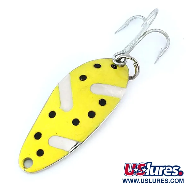 Una vivace finitura in smalto giallo con audaci punti neri caratterizza questo Little Cleo, un classico ondulante di produzione americana dal peso di 1/4 oz (7 g). Con una lunghezza di 1 1/2" (4 cm), l'esca mostra un distintivo patrimonio pre-Acme con i marchi 'SENECA LURE' e 'WIGL-LURE' profondamente impressi sul retro in nichel lucidato. Questo particolare esemplare, catalogato con il codice prodotto 11018, presenta un accattivante motivo a macchie nere su fondo giallo, diviso da strisce bianche curve che aggiungono contrasto visivo al corpo metallico. La componentistica consiste in un robusto ancoretta unita al cucchiaino da un solido anellino spaccato in acciaio. Le condizioni sono valutate 5/5, con le superfici verniciate e nichelate che mostrano un'eccellente conservazione risalente al periodo di produzione originale di Seneca negli Stati Uniti.