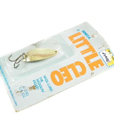 La doratura conferisce una finitura intramontabile a questo ondulante da 7g (1/4 oz), una classe di peso che si è dimostrata efficace per decenni sia in acqua dolce che salata. Lungo 4 cm (1 1/2"), questo Seneca Little Cleo riporta il codice prodotto 2882 e rappresenta un'era fondamentale nella storia dell'attrezzatura da pesca, prima dell'acquisizione del marchio da parte di Acme nei primi anni '80. Questo esemplare è particolarmente degno di nota per lo stampo di una Hula Girl sul lato concavo, un dettaglio che molti pescatori esperti ritengono abbia contribuito allo status leggendario dell'esca prima che il design venisse semplificato. L'esca è in condizioni non utilizzate, con una valutazione di 6, e rimane sigillata nella sua confezione blister vintage originale. Il retro della scheda evidenzia la sede della divisione Seneca a Providence, RI, e fornisce istruzioni specifiche per lo spinning o la traina a specie come trota, salmone e luccio. L'hardware include un amo triplo montato in fabbrica, che non mostra segni di invecchiamento o usura.
