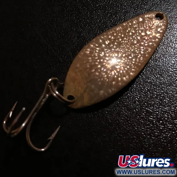 Martellata con una trama Crystal, la finitura a scaglie di rame su questo cucchiaino vintage cattura la luce in un modo unico e sfaccettato. Questo specifico Little Cleo Crystal, identificato dal codice prodotto 7672, risale all'era precedente all'acquisizione della Seneca Lure Co. da parte di Acme Tackle nei primi anni '80. Con un peso di 1/4oz (7g) e una lunghezza di 1 1/2" (4cm), la paletta presenta l'iconica silhouette a goccia che è diventata un classico nelle cassette da pesca di tutti gli USA. Il retro dell'esca è chiaramente punzonato con il marchio Seneca e l'esemplare è in condizioni 5/5, con superfici ben conservate e marcature nitide. Un classico amo triplo è fissato da un robusto anello spaccato alla base, mentre l'occhiello superiore rimane libero per un moschettone o un finale. I collezionisti cercano spesso queste versioni originali Seneca per la profondità e il carattere specifici dei loro motivi stampati.