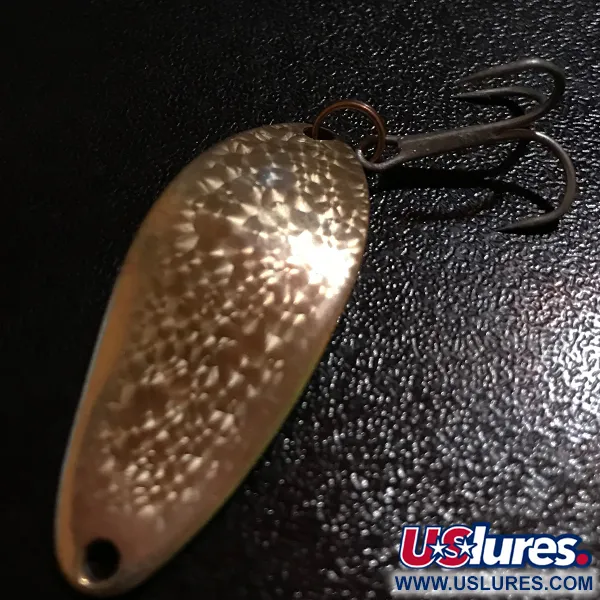 Le superfici sfaccettate sul corpo in oro martellato distinguono questo Little Cleo Crystal dell'epoca Seneca, un frammento di storia dell'attrezzatura americana prodotto prima dell'acquisizione da parte di Acme nei primi anni '80. Con un peso di 1/4 oz (7 g), l'ondulante misura 1 1/2" (4 cm) e riporta chiaramente il marchio "LITTLE CLEO WIGL-LURE A SENECA LURE" impresso sul lato concavo. La denominazione del colore Crystal si riferisce alla specifica texture multi-angolare progettata per catturare la luce, abbinata a un classico anellino spaccato color rame e a un'ancora originale affilata. Prodotto negli USA, questo esemplare riporta il codice prodotto 8326 ed è conservato in condizioni 5/5. Il suo profilo curvo e pesante riflette l'originale progettazione Seneca destinata al lancio e alla traina, rappresentando un'epoca specifica della produzione di esche prima del passaggio del marchio ad Acme.