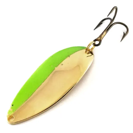 Inciso con il peso di 3/4 oz (21 g) sul lato concavo in oro lucido, questo ondulante cattura un'epoca specifica della produzione di attrezzatura americana. Il corpo da 6,5 cm (2 1/2") presenta la leggendaria incisione della ballerina "Hula Girl", un dettaglio che identifica la produzione originale Seneca prima dell'acquisizione da parte di Acme nei primi anni '80. Questo esemplare, identificato dal codice prodotto 13241, mette in mostra una sorprendente finitura bicolore che combina un lato verde fluorescente ad alta visibilità con una metà dorata riflettente. La componentistica include un robusto anellino spaccato dorato e un'ancoretta con finitura scura che rimane in ottime condizioni. I collezionisti ricercano questi esemplari dell'era Seneca specificamente per la presenza del logo della ballerina, che molti pescatori veterani ritengono sia stato un fattore significativo nel successo storico dell'esca. La superficie mostra lievi segni del tempo che ne attestano l'età, con una valutazione delle condizioni di 4/5. Le scritte profondamente incise e l'iconica figura della ballerina vicino alla coda rimangono nitide e ben definite.