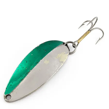 Finiture metalliche nichel e verde dividono la parte frontale di questo ondulante da casting da 5,5 cm (2 1/4"), identificandolo come una classica produzione Seneca. Questo Little Cleo (HULA GIRL) reca sul retro l'iconico marchio della ballerina, un dettaglio molto apprezzato dai collezionisti che Acme ha rimosso dopo aver acquisito il marchio nei primi anni '80. Punzonato con la dicitura "WIG-L LURE" e il nome "LITTLE CLEO", il lato posteriore mantiene una brillantezza lucida. Con un peso di 18 g (2/3 oz), l'artificiale è dotato di un'ancoretta con un caratteristico gambo rivestito in ottone. L'esemplare, identificato dal codice prodotto 20638, è in condizioni 4/5, mostrando una leggera e naturale usura sulla parte verniciata in verde che ne testimonia la storia. È stato realizzato negli USA in un'epoca in cui la "Hula Girl" era considerata un portafortuna dai pescatori di tutto il paese. Il robusto split ring assicura che l'armatura rimanga ben salda durante il lancio.