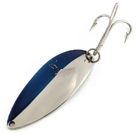 Con la superficie frontale divisa tra una finitura blu intenso e cromo lucido, questo ondulante prodotto da Seneca rappresenta un esempio eccezionale di attrezzatura vintage. Con una lunghezza di 6,5 cm (2 1/2") e un peso di 21 g (3/4 oz), trasmette la solidità tipica delle prime produzioni. Sul retro, l'iconica ballerina "Hula Girl" è chiaramente punzonata nel metallo, segno distintivo dell'era Seneca Lure Company prima dell'acquisizione da parte di Acme all'inizio degli anni '80. I collezionisti ricercano spesso questo specifico marchio della ballerina, poiché venne rimosso dalle successive versioni prodotte in serie. Questo esemplare, identificato dal codice prodotto 22171, è in condizioni eccellenti con un punteggio di 5/5. La punzonatura posteriore ne conferma la provenienza dalla Seneca Tackle Co. e indica il peso per un facile riferimento. Il punto di attacco presenta un anellino brisè pulito collegato all'ancoretta originale.