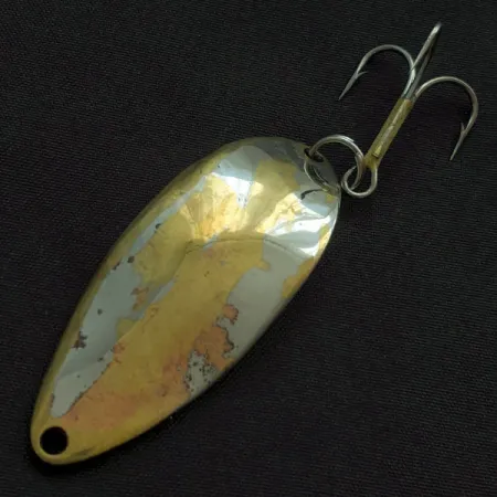 Con un peso di 18g (2/3oz), questo classico ondulante è un pezzo di storia della pesca dell'azienda Seneca Lure. Il lato posteriore presenta il leggendario stampo "Hula Girl" insieme alla scritta "WIGL LURE", un dettaglio notoriamente rimosso dopo che Acme ha acquisito il marchio negli anni '80. Con una lunghezza di 5,5 cm (2 1/4"), questo esemplare mostra una particolare finitura a tre tonalità in nichel, ottone e rame. Ha una valutazione dello stato di 3/5, mostrando il carattere autentico di un artificiale che ha passato del tempo in acqua, con la placcatura originale che si sta consumando per rivelare i toni caldi del metallo sottostante. Per il collezionista di attrezzatura made in USA, questo particolare modello (codice prodotto 22427) rappresenta l'epoca precedente alla semplificazione del design. La componentistica include un robusto anellino spaccato e un'ancoretta, pronti per il lancio o la traina. Il foro sull'estremità stretta fornisce un punto di attacco semplice e diretto per la lenza o il terminale.