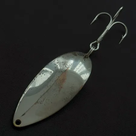 Tonalità di nichel e rame dominano la finitura di questo ondulante da 2 1/2" (6,5 cm), che presenta sul retro il ricercato marchio inciso della ballerina Hula Girl. Questa grafica iconica era un segno distintivo della Seneca Lure prima che il marchio passasse ad Acme all'inizio degli anni '80. I collezionisti ricercano molto questa versione, identificata dal codice prodotto 22714, poiché l'immagine della ballerina è stata successivamente rimossa nelle produzioni più recenti. Il pesante corpo metallico da 3/4oz (21g) mostra una leggera usura coerente con una valutazione 4/5, mantenendo una superficie brillante che cattura efficacemente la luce. Prodotta negli USA, l'esca è armata con una grande ancoretta progettata per il lancio o la traina. Le incisioni relative al peso e al nome Little Cleo rimangono ben leggibili sullo sfondo metallico.