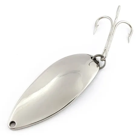Sul retro in cromo lucido di questo cucchiaino da 21 g (3/4 oz) è stampata l'iconica ballerina, un segno distintivo della produzione originale della Seneca Lure nota come Hula Girl. Con una lunghezza di 6,5 cm (2 1/2 pollici), questo esemplare risale all'epoca precedente all'acquisizione del marchio da parte di Acme nei primi anni '80, quando il motivo della ballerina fu rimosso dagli stampi. Molti pescatori esperti sostengono che sia stata proprio questa grafica a consolidare la reputazione di successo della Little Cleo in acqua. Identificato dal codice prodotto 22881, l'artificiale presenta un corpo in metallo ad alto spessore e una grande ancoretta assicurata da un robusto split ring. La superficie mostra una finitura ad alta brillantezza e le condizioni di questo pezzo sono un solido 5/5. L'incisione profonda sul retro riporta chiaramente il nome Seneca e l'origine USA, rendendolo un pezzo autentico della storia delle attrezzature da pesca americane.
