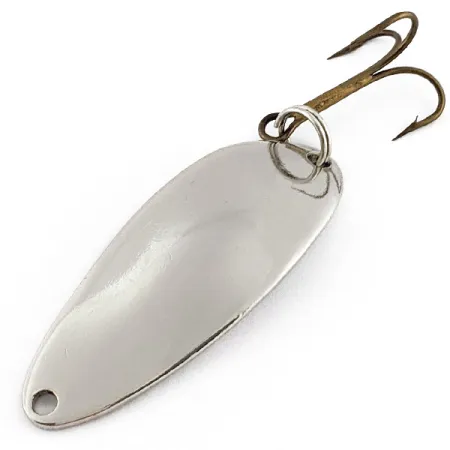 La finitura nichelata di questo ondulante da 4,5 cm (1 3/4") offre un riflesso ad alta visibilità che rimane un elemento essenziale in molte cassette da pesca. L'iconica 'Hula Girl' e il nome del marchio sono chiaramente punzonati nel metallo, un dettaglio classico dei tempi della produzione Seneca negli USA. Con un peso di 10 g (1/3 oz), l'esca offre una densità notevole per lanci a lunga distanza o per la traina controllata. Questo esemplare specifico, identificato dal codice prodotto 22885, è in condizioni 5/5, mantenendo una superficie brillante senza l'usura che spesso si riscontra negli artificiali vintage in metallo. Un'ancoretta in bronzo affilata è fissata saldamente tramite un robusto split ring, pronta per l'azione di pesca. La parte anteriore presenta un foro di aggancio ben rifinito, progettato per una legatura diretta o per l'uso di un moschettone.