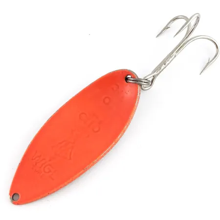 Con un peso di 21g (3/4oz), questo ondulante Seneca presenta l'iconica silhouette Hula Girl chiaramente impressa nel suo corpo metallico. Questo specifico Little Cleo, catalogato con il codice prodotto 23349, misura 6,5 cm (2 1/2") e sfoggia una distinta estetica bicolore con vernice arancione vivace sulla curva esterna e una finitura in nichel lucido sul lato concavo. La punzonatura rimane notevolmente nitida, evidenziando il marchio "WIGL", il nome "Little Cleo" e l'identificativo del marchio Seneca. La sua componentistica consiste in un robusto anellino spaccato e un'ancoretta pulita, entrambi in ottima forma. Una valutazione delle condizioni di 5/5 riflette la natura ben conservata di questo esemplare; il pigmento arancione è brillante e saturo, mentre il lato nichelato mantiene un riflesso profondo e specchiato. Questa classe di peso è una scelta tradizionale per il lancio a distanza quando si insidiano specie più grandi in acque profonde. La figura incisa della Hula Girl rimane una caratteristica storica definitoria della linea Cleo, e qui è presentata senza alcuna usura sulle linee sottili del disegno.