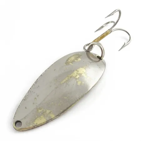 Le finiture nichel e oro si fondono sulla superficie di questo ondulante da 2 1/4" (5,5 cm), rivelando il carattere di un artificiale che ha vissuto numerose sessioni in acqua. Questo specifico esemplare, identificato dal codice prodotto 23493, è la versione da collezione "Hula Girl" prodotta da Seneca Lure negli Stati Uniti. Sul retro concavo, l'iconica immagine incisa della ballerina di hula è ancora visibile insieme ai marchi "LITTLE CLEO" e "WIG LURE", una caratteristica che fu notoriamente rimossa dopo che Acme rilevò la produzione all'inizio degli anni '80. Molti pescatori esperti sostengono che proprio questa punzonatura fosse il segreto del successo leggendario di questa esca. Con un peso di 1/2 oz (14 g), offre una massa ideale per raggiungere lunghe distanze nel lancio. La componentistica originale, inclusi l'anellino spaccato e l'ancoretta, mostra i segni del suo percorso vintage, con una valutazione dello stato pari a 3/5. Si presenta come un autentico pezzo di storia del fishing risalente a un'epoca precedente alla semplificazione del design per la produzione di massa moderna.