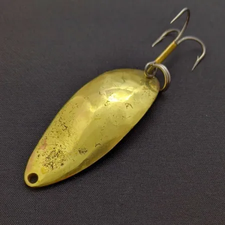 La placcatura dorata cattura immediatamente l'attenzione su questo cucchiaino da 1/2 oz (14 g), che mette in mostra il classico profilo a goccia che ha servito i pescatori per decenni. Valutata con una condizione di 3/5, la superficie metallica presenta un aspetto vissuto con qualche segno di usura che testimonia la sua storia in acqua, pur restando solida e pronta per essere collezionata o lanciata. Girando il corpo da 2 1/4" (5,5 cm) si trova l'iconica ballerina "Hula Girl" stampata nel metallo: un segno distintivo della produzione originale Seneca prima che il marchio passasse ad Acme nei primi anni '80. Molti pescatori veterani preferiscono questa specifica versione, catalogata con il codice prodotto 24090, convinti che la presenza della ballerina sia il segreto della sua leggendaria efficacia. La componentistica include una robusta ancoretta fissata tramite un solido anellino spaccato, garantendo che l'esca rimanga integra anche sotto l'attacco di pesci predatori aggressivi. Orgogliosamente punzonato come prodotto negli USA, questo esemplare rappresenta un'epoca in cui la produzione di esche si concentrava su dettagli di stampaggio complessi che le versioni moderne spesso trascurano.