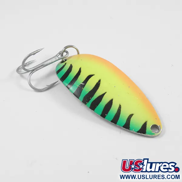 Vivaci tonalità Fire Tiger di giallo, verde e arancione coprono la faccia convessa di questo ondulante da 14 g (1/2 oz). Contraddistinto dal codice articolo 2540, il retro in argento lucido presenta l'iconico marchio della ballerina "Hula Girl" che ha definito la produzione originale della Seneca Lure Company. Lungo 5,5 cm (2 1/4"), il corpo in metallo mantiene la sua finitura lucida e il marchio ben definito. I collezionisti cercano spesso questa versione specifica perché il logo della ballerina è stato interrotto dopo che Acme ha acquisito il marchio all'inizio degli anni '80. L'armamento è composto da un robusto anellino spaccato e un'ancoretta affilata. Senza segni di usura, le condizioni di questo esemplare sono valutate 5/5. I dettagli stampati sul retro indicano l'autentica origine USA, conservando una parte di storia della pesca dell'epoca in cui questi artificiali sono diventati leggendari per lo spinning e la traina.