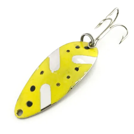 Smalto giallo con punti neri e strisce in nichel lucidato caratterizzano il lato frontale di questo vintage Seneca Little Cleo (Hula Girl). Questo specifico modello, identificato dal codice prodotto 8686, pesa 2/3oz (18g) e misura 2 1/4" (5,5cm) di lunghezza. Girando l'esca si trova la leggendaria ballerina di hula stampata nella nichelatura insieme al marchio "WIGL", una caratteristica distintiva dell'epoca precedente all'acquisizione di Seneca da parte di Acme nei primi anni '80. La finitura anteriore mostra un'usura minima, con una valutazione dello stato di 4/5, mentre il retro mantiene la sua brillante qualità riflettente. Prodotto originariamente negli USA, questo ondulante è equipaggiato con il suo anello spaccato originale e un robusto amo triplo per il lancio e la traina. La presenza dell'incisione della ballerina è un dettaglio significativo per i collezionisti, poiché è stata gradualmente eliminata nelle produzioni successive.