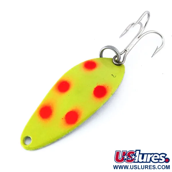 Con un peso di 7 g (1/4 oz), questo ondulante vintage sfoggia un caratteristico schema cromatico a cinque punti rossi su una base giallo neon. Questo Little Cleo UV, identificato dal codice prodotto 10707, è stato prodotto negli USA da Seneca Lure prima che il marchio venisse acquisito da Acme all'inizio degli anni '80. Il corpo in metallo da 4 cm (1 1/2") è rifinito con un retro in nickel lucido, mentre la parte anteriore presenta uno speciale rivestimento UV-reattivo che brilla di verde acceso in condizioni di scarsa luminosità. Classificato come esemplare 6, l'esca è in condizioni non utilizzate, preservando la finitura e i componenti originali di fabbrica. L'ancoretta singola rimane affilata ed è fissata saldamente con l'anellino spaccato originale.