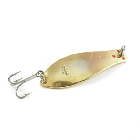 Sulla parte concava del metallo è chiaramente punzonata la sigla "DOCTOR 255", marchio distintivo della Prescott Spinner Company. Questo ondulante con finitura dorata pesa 1/4oz (7g) e misura 1 3/4" (4,7cm) di lunghezza, caratterizzato da tre distinti punti rossi vicino all'occhiello che creano un classico contrasto visivo. Identificata dal codice prodotto 2902, l'esca è armata con una semplice e affilata ancoretta fissata tramite un anello spaccato, mantenendo l'originale efficacia di questo classico di produzione americana. Le condizioni sono ottime (4/5), con una superficie molto pulita che mette in risalto la qualità della placcatura in oro. La fattura rispecchia i robusti standard produttivi tipici del Wisconsin di un tempo, con il corpo metallico che conserva la forma e la lucentezza originali.