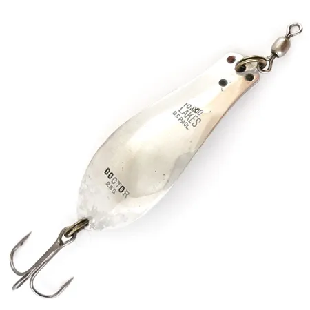 La nichelatura sul lato anteriore di questo ondulante da 7 g (1/4 oz) è stampata con le diciture "10,000 LAKES ST. PAUL" e "DOCTOR 255", che lo identificano come un pezzo classico della storia della pesca del Minnesota. Prodotto da Prescott Spinner con il codice prodotto 4989, il Little Doctor 255 presenta un netto contrasto tra la faccia in nichel lucido e il retro dai caldi toni dorati. Con una lunghezza di 4,7 cm (1 3/4"), l'esca è armata con un robusto ancoretta e una girella a barilotto all'occhiello. Questo specifico esemplare mantiene una valutazione di condizione 4/5, mostrando sottili segni della sua origine vintage pur rimanendo straordinariamente pulito. La forma a goccia dell'ondulante è un design caratteristico dell'azienda statunitense, destinato ad applicazioni di lancio versatili.