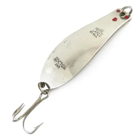 La punzonatura sulla faccia argentata reca la scritta "DOCTOR 255" e "10,000 LAKES ST. PAUL", contrassegnando questo Prescott Spinner come un pezzo di storia della pesca del Minnesota. Con una lunghezza di 4,7 cm (1 3/4"), l'esca presenta una finitura a contrasto con un frontale in argento lucido e un retro in oro liscio. Tre punti rossi sono posizionati vicino all'occhiello, fornendo un classico punto focale visivo sul corpo metallico. Questo ondulante da 7 g (1/4 oz), identificato dal codice prodotto 5360, è dotato della sua ancoretta originale. Prodotta negli USA, l'esca è in condizioni 5/5, mantenendo un alto livello di brillantezza su entrambe le superfici placcate.