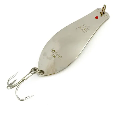 La placcatura in argento su un lato e l'ottone lucidato sull'altro conferiscono a questo Prescott Spinner Little Doctor 255 il suo caratteristico aspetto ad alto contrasto. Con un peso di 7 g e una lunghezza di 4,7 cm, l'esca presenta una forma a goccia stretta progettata per lanci e traina efficienti. Sul lato argentato sono stampati in modo leggibile l'identificativo "DOCTOR 255" e il marchio del produttore "PRESCOTT SPINNER ST. PAUL", che ne conferma l'origine statunitense. Un singolo punto rosso è posizionato vicino all'occhiello di aggancio per fungere da punto focale visivo durante il recupero. Con una valutazione di conservazione di 5/5, le superfici metalliche sono lucide e prive di usura. L'ondulante è dotato di un robusto amo triplo fissato tramite un anello spaccato standard sulla coda.