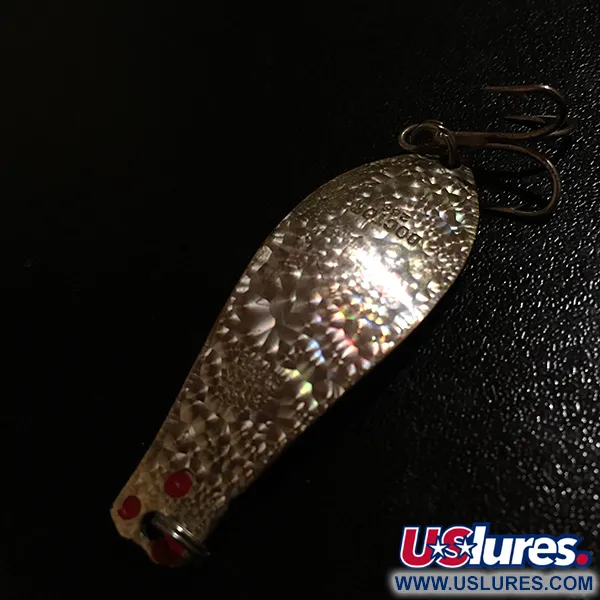 Le trame martellate sul retro del corpo metallico da 1/4oz (7g) contrastano magnificamente con la rara finitura olografica Crystal dorata sul davanti. Sono chiaramente impressi nel metallo i marchi 10.000 LAKES ST. PAUL insieme alla designazione del modello DOCTOR 255, che ne identifica le origini Prescott Spinner nel Minnesota, USA. Con una lunghezza di 1 3/4" (4,7 cm), questo esemplare è in condizioni eccezionali, valutato 5/5, con la sua superficie dorata riflettente e i dettagli rossi che rimangono nitidi. La struttura include un'ancoretta standard fissata alla base, progettata per applicazioni a spinning o a traina. Questa versione specifica, identificata dal codice prodotto 5470, si distingue per le proprietà uniche di rifrazione della luce della sua superficie strutturata in cristallo dorato.