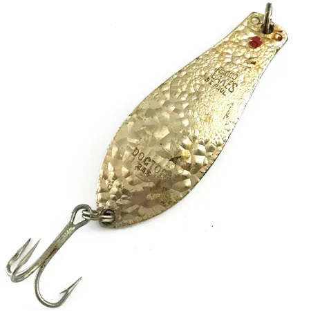 Chiaramente impresso sul metallo martellato si trova il marchio 'DOCTOR 255' insieme alla sua origine St. Paul, MN. Con un peso di 1/4 oz (7 g), l'ondulante presenta una finitura Crystal Golden con una profonda trama martellata progettata per riflettere la luce durante il recupero. Il corpo in metallo misura 1 3/4" (4,7 cm) ed è in condizioni 5/5, con una superficie brillante e pulita. Un caratteristico punto d'accento rosso vicino all'occhiello superiore fornisce un punto di colore localizzato contro la placcatura dorata. Catalogato con il codice 6168, l'esca è dotata di un'ancoretta e anelli spaccati in ottime condizioni. Questo classico ondulante di produzione americana si affida al suo design appesantito e affusolato per un'efficace performance a lancio o a traina.