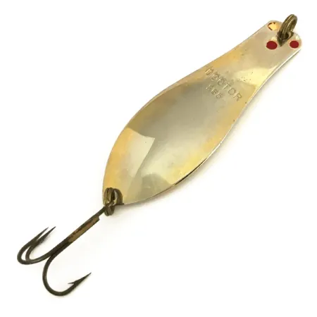 Con un peso di 1/3 oz (10 g), questo ondulante rimane una scelta versatile per diverse specie d'acqua dolce. Il nome 'DOCTOR 265' è chiaramente stampato nel metallo dorato, identificandolo come un classico componente prodotto negli USA. Lungo 2 1/2" (6,5 cm), questo esemplare presenta due distinti punti rossi vicino all'occhiello superiore, che creano un contrasto visivo sul corpo metallico. La componentistica consiste in una robusta ancoretta fissata tramite un anello spaccato in coda, con un anello spaccato corrispondente in testa per il fissaggio della lenza. Con il codice prodotto 7693, la placcatura in oro mostra lievi segni di utilizzo pur mantenendo una condizione di 4/5. Il lato convesso mantiene la sua lucentezza, mentre il retro concavo mostra un tono dorato invecchiato più opaco, tipico delle esche metalliche di quell'epoca.