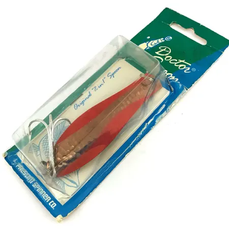 Texture in rame martellato abbinate a una faccia a spirale arancione vibrante definiscono l'estetica classica di questo esemplare Prescott Spinner. Con un peso di 3/4 oz (21 g), il Little Doctor 275 è progettato per la versatilità, storicamente commercializzato come un cucchiaino ondulante "2 in 1" perché consente di fissare l'amo a entrambe le estremità per modificare la presentazione. Questo artificiale specifico, catalogato con il codice prodotto 8680, è ancora sigillato nella sua confezione blister vintage originale. La componentistica presenta un'ancoretta robusta e affilata, progettata per resistere alla forza di lucci, muskies o trote di lago. Mentre il lato martellato fornisce lampi riflettenti, il lato a spirale ad alto contrasto è pensato per la visibilità durante la traina, lo spinning o il vertical jigging. Poiché non è mai stato rimosso dal cartoncino prodotto da KOTCO Manufacturing, l'esca è inutilizzata. La confezione fornisce indicazioni tecniche per diverse profondità, suggerendo il fissaggio della lenza all'estremità larga per un movimento più ampio o all'estremità stretta per pesche in profondità.