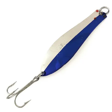 Un peso di 21 g conferisce al Prescott Spinner Little Doctor 275 la massa necessaria per il lancio o la traina. La parte anteriore dell'ondulante presenta una pulita finitura bicolore Nichel / Blu, evidenziata da un piccolo dettaglio dell'occhio dipinto in rosso vicino all'anello di attacco. Sul corpo metallico è chiaramente stampato il codice 9106, che funge da identificatore affidabile per questo modello vintage prodotto negli USA. Con una lunghezza di 9 cm, l'esca mantiene un profilo sottile con il lato posteriore interamente nichelato che riflette la luce nella colonna d'acqua. Questo esemplare è in condizioni 5/5, con superfici straordinariamente pulite sia sul corpo metallico che sull'ancoretta originale.