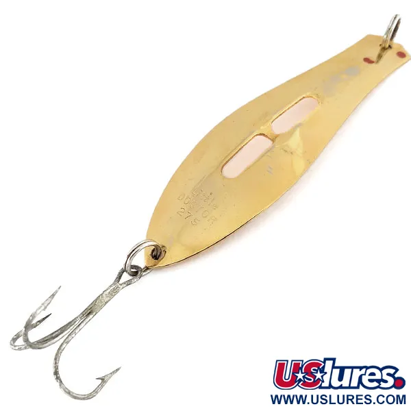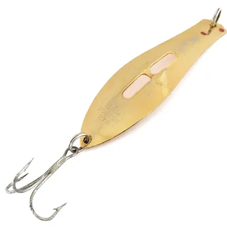 Una finitura in oro lucido copre l'intera superficie di 9 cm (3 1/2") di questo classico cucchiaino da traina. La Prescott Spinner Company ha progettato il Little Doctor 275 con un centro asolato unico, firma funzionale della loro linea vintage. Il nome del modello e la dimensione sono chiaramente stampati nel corpo metallico da 17 g (3/5 oz), indicando la sua eredità professionale. Questo particolare esemplare è in condizioni 5/5, mantenendo una superficie pulita e riflettente su tutto il suo profilo allungato. Dotato di un robusto amo triplo fissato tramite un solido anello spaccato, è costruito specificamente per le tecniche di traina dove peso e profilo sono fondamentali. Il marchio del produttore rimane nitido e la struttura complessiva riflette gli standard qualitativi della produzione di attrezzatura da pesca di metà secolo con il codice prodotto 9649.