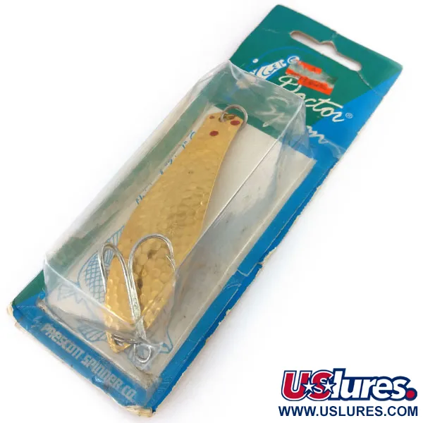 Una placcatura in oro martellato ricopre l'intera superficie di questo ondulante da 9 cm (3 1/2"), punteggiata da distinti punti rossi vicino all'occhiello superiore. Con un peso di 21 g (3/4 oz), il Little Doctor 275 è un design classico e versatile prodotto dalla Prescott Spinner Co., entrata poi a far parte della linea KOTCO Manufacturing di Akron, Ohio. Questo particolare esemplare, con codice prodotto 9748, è conservato nella sua confezione blister vintage originale. L'esca stessa è inutilizzata e mostra la qualità brillante e riflettente della finitura metallica martellata. La serie "Doctor" è nota per la sua versatilità a doppia estremità; sebbene qui sia montata con un'ancoretta argentata ad alta resistenza all'estremità larga, il design consente l'attacco della lenza su entrambi i lati per variare profondità e resistenza durante la traina o il lancio. Il retro della confezione conferma la sua efficacia per insidiare specie di grandi dimensioni come lucci, muskellunge e walleye.